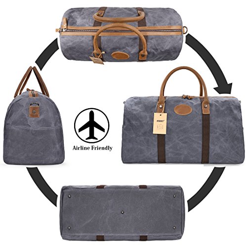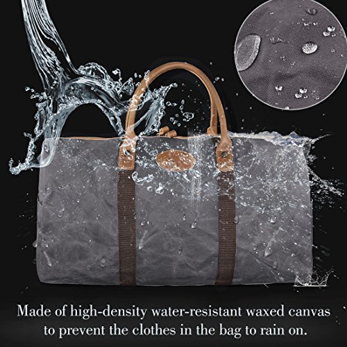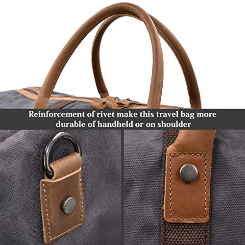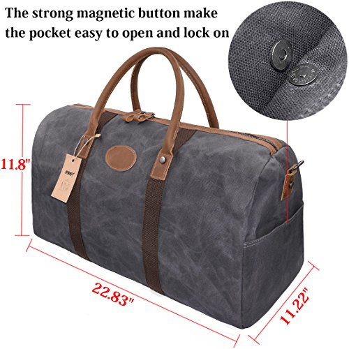 -. Feature : 【Premium Genius Leather & High-density Canvas】This travel duffel bag is made of High-density water-resistant waxed canvas and superior cowhide crazy horse leather,the top quality hardware ensure long lasting durability.The high-density canvas won't rip or tear when you put a lot of things in the duffel tote. / 【Overlarge Size】You would be surP.R.Ised at this tote bag's size,the large main compartment and various inner pockets is perfect for all kinds of clothes,books and traveling necessities,this travel bag is suitable for 3-4 days weekender or business trip. / 【Comfortable for Use】The handles are rounded which makes it comfortable as a carry on handbag,The bag also has a detachable wide adjustable canvas strap that can be used as a shoulder bag.The available size for the strap is from 27.9" to 52" which can be applied to different height and body's type. / 【Duffels Dimensions】This travel bag dimensions is 22.83"(L)x11.22"(W) x 11.8"(H) with Interior 1 large main compartment and 2 zipper pocket,2 small pockets for cell phone or coin.Exterior with 2 side magnetic button pockets. The Strap Width: 2.16''. / 【Classic Style】This fashion duffel bag also fit for men and women,it's perfect for the people who often go for business trip,traveling,camping and outdoor activities.