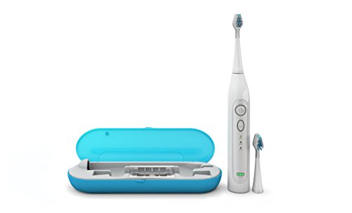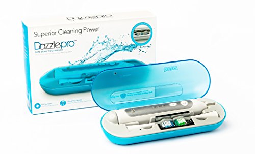 The Dazzlepro Elite Sonic Toothbrush with UV Sanitizing Charging Case uses state-of-the-art sonic technology to powerfully remove plaque and debris from teeth and gums. Its replaceable brush heads polish and remove surface stains and give you a brighter smile. It also offers 3 brush modes so that you can customize your oral hygiene needs: Clean gently brushes sensitive areas; Dazzle provides the most powerful and thorough brushing; and Pulse brushes teeth, stimulates and massages gums, and helps to eliminate tartar buildup that can lead to gingivitis. The Dazzlepro Elite Sonic Toothbrush with UV Sanitizing Charging Case also blasts off plaque with 40,000 tiny brush strokes per minute. Just move the brush head from tooth to tooth and let the bristles do the actual “work.” The toothbrush also automatically shuts off after you’ve brushed for the dentist-recommended two minutes ? and seriously, when’s the last time you actually counted to make sure you brushed for the full two minutes? The American Dental Association recommends brushing your mouth in quadrants ? upper right, lower right, upper left, lower left ? for 30 seconds each. While you’re brushing, the toothbrush briefly pauses every 30 seconds so you know it’s time to move to the next quadrant. The Charging Case also operates as a UV sanitizer for your toothbrush heads. Hundreds of millions of bacteria and microorganisms live in our mouths, causing tooth decay and gum disease, and these bacteria end up on our toothbrushes. But just 10 minutes under the powerful UV light of the Dazzlepro UV Sanitizing Charging Case after you brush kills 99% of these bacteria, ensuring that your toothbrush is clean and ready for the next time you use it. The hardcover case stores and protects your toothbrush while it’s charging, plus it’s super lightweight, so it’s ideal for travel. One full charge of the Dazzlepro Elite Sonic Toothbrush will yield approximately two weeks of brushing. Replace brush heads every three months (available on Amazon.com). Never submerge the Dazzlepro Elite Sonic Toothbrush Handle or UV Sanitizing Charge Case in water, or place it under running water. 0 |