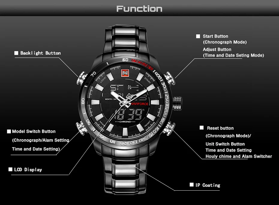 Feature:Alarm,Back Light,Water Resistant,Stop Watch,Complete Calendar,Chronograph,Auto Date,LED display
