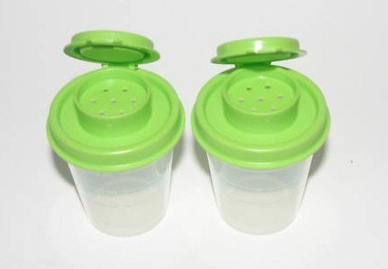 [Product Information]- Tupperware Personal Size Clear Midget Salt and Pepper Shakers w/ Green Seals
