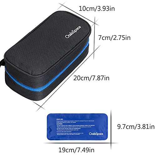 Insulin Cooling Wallet (travel carrier) is designed to provide a convenient and affordable way to keep medicines (such as insulin or other medicines that are injected,) at a safe temperature insulin travel bag Size: 7.87*3.93*2.75 inches; Right size to carry daily For: 2 insulin pens; LCD Display Size 1.57*0.8", 2 button batteries (included) Cold source: 2 Ice Packs Gelsize: 7.5*3.8"; Weight: 150g /pc; Keeps pens cool on the hottest days Usage: 1. Before using, put two ice packs in the freezer whose temperature is around -15 to -20°C for fully frozen. It takes about 8 to 10 hours. 2. Then put the packs into the net pocket of the insulin bag. 3. After 1-2 minutes, put insulin in the inner pocket And enjoy your traveling; no longer have to worry about your Insulin, the working time is about 6 to 8 hours or more. Perfect for traveling on airline About OasisSpace Our vision is to create a Space where you can take time, enjoy your life. We wish you happy every day with our product. If you have any questions, please feel free to contact us.