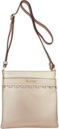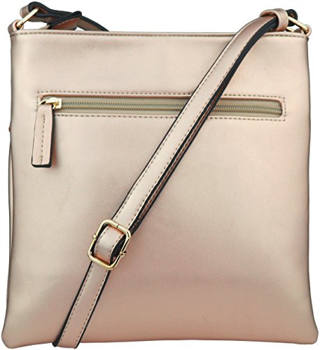 Fashion crossbody handbag that is made with faux leather with a black and white striped fabric lining. The purse is lightweight and incredibly comfortable to use on an everyday basis. It has a zipper closure at the top and a pocket with magnetic clasp closure at the front and a zipper pocket at the back. There are two pockets in the lining and a zipper pocket inside of the purse.