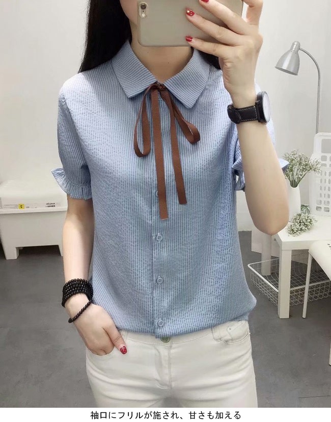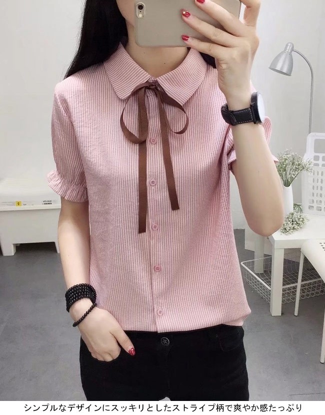 半袖シャツ レディース ストライプ柄 折り襟 ブラウス 半袖 リボン付き 女性用 薄手 トップス 夏物 スクール風 爽やか 着まわしレディース用の半袖シャツが登場肌触りのいい薄手素材を厳選、夏に最適な着心地をもたらす光沢ありの茶色リボンはとても上品な雰囲気を作り出すゆったりし過ぎずタイト過ぎずのサイズ感は美しいボディーラインを引き立てるシンプルなデザインにスッキリとしたストライプ柄で爽やか感たっぷり袖口にフリルが施され、甘さも加えるパンツコーデにもスカートコーデにも似合い、ボトムス選ばずに着れる一枚カラー:1 2 3素材 ポリエステルサイズ(cm) S M L XLS 肩幅36 バスト88 着丈61M 肩幅37 バスト92 着丈62L 肩幅38 バスト96 着丈63XL 肩幅39 バスト100 着丈64ご注意:※サイズは平置きサイズです。素人採寸ですので、若干の誤差がございます、ご了承ください。