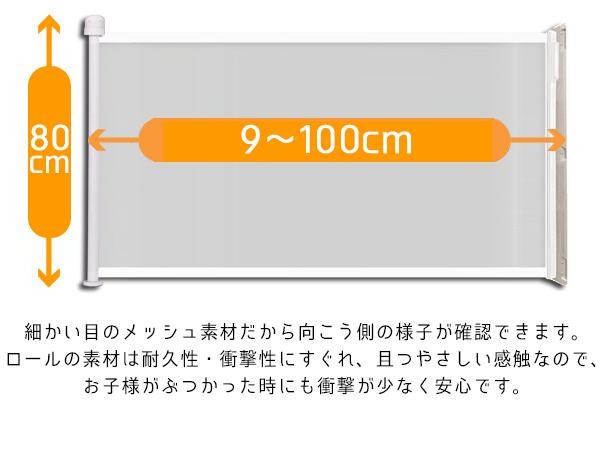 | サイズ | ゲート本体/ロール:高さ80×長さ9~100cm、収納部:6.5cm角×高さ87cm、ロール受け板:幅5×厚さ1.5×高さ84cm 個装サイズ:9×9×90cm |