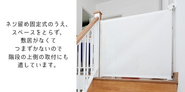| 使用しない時にはすっきり収納できてお部屋の雰囲気を壊さない、ロール式のベビーゲートです。お子様が台所や危険な場所へ入れないようガードします。ネジ留め固定式の上、スペースをとらず、敷居がなくてつまずかないので階段の上側の取付にも適しています。開閉も片手で簡単♪お子様が視界に入るよう、ロールには透けて見えるメッシュ素材を採用しています。 |