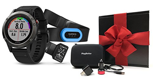 GIFT BUNDLE INCLUDES: Garmin fenix 5 (Slate Gray with Black Band) Multi-Sport Training GPS Watch, HRM-Tri Chest Strap, PlayBetter USB Vehicle & Wall Charging Adapters, PlayBetter Hard GPS Protective Case, Black Gift Box & Red Bow!