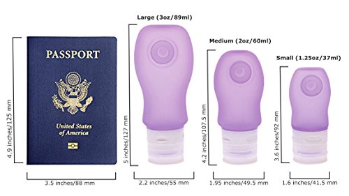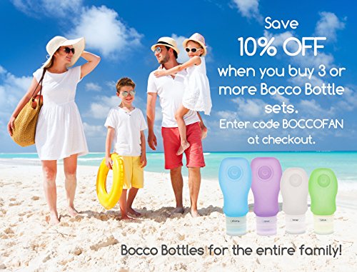 -. Feature : This 4 Pack Includes 4 Large (3 oz/89 ml) Bottles. Bocco Bottles are available in 3 Sizes: SMALL (1.25 oz/37 ml), MEDIUM (2 oz/60 ml), LARGE (3 oz/89 ml) - and in 6 Colors: Pink, Purple, Blue, Clear, Green, and Orange. / INNOVATIVE DESIGN: Squeezable Silicone Travel Bottle with Leak Proof Valve Technology, ID Windows, Temporary Suction Cup and Large Opening for Easy Filling. Read product description below for in-depth design description. / EASY TO USE: Squeeze and release to get exactly how much you want without globs of excess oozing out. Works great with low or medium viscosity fluids such as Shampoo, Conditioner, Body Wash, Sunscreen and Lotions. Not recommended for oil-based products or products containing silicone. / SAFE & DURABLE: TSA Approved Carry On Travel Size Bottles. Specially designed to prevent leakage during altitude pressure changes. / GREAT GIFT IDEA for Friends & Family: Fill them up with your Favorite Toiletries to bring along to the Gym, Work, Camping or in you Purse. Can also be used around the Kitchen to store Sauces or Baby Food. (100% Food Grade Silicone - BPA Free and FDA Approved)