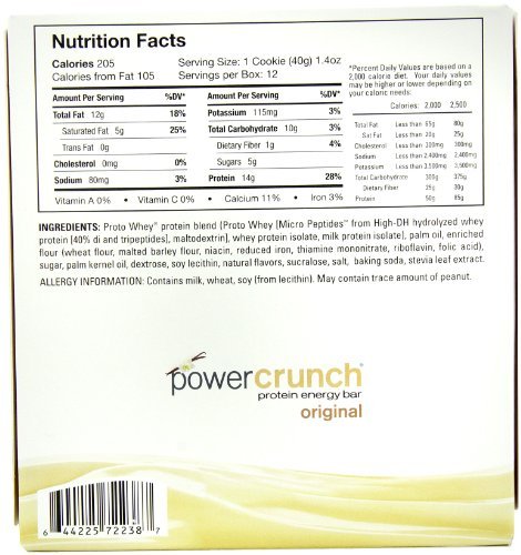 -. Binding : Health and Beauty -. Brand : Power Crunch -. EAN : 0767644842655 -. Feature : A high-protein, creme-filled wafer cookie bursting with Proto Whey protein / Provides sustained hunger satisfaction without any heaviness / Produced with the highest quality whey hydrolysates that provide 100% absorption of protein / Very low glycemic response; diabetic-friendly product -. IsAdultProduct : 0 -. Label : BIONUTRITIONAL RESEARCH GROUP -. Manufacturer : BIONUTRITIONAL RESEARCH GROUP -. MPN : 644225722387 -. PackageQuantity : 1 -. PartNumber : 644225722387 -. ProductGroup : Health and Beauty -. ProductTypeName : HEALTH_PERSONAL_CARE -. Publisher : BIONUTRITIONAL RESEARCH GROUP -. Studio : BIONUTRITIONAL RESEARCH GROUP -. Title : Power Crunch Protein Energy Bar Orignal, French Vanilla Creme, 1.4-Ounce Bars, 12 Count (Pack of 3) -. UPC : 644225722387