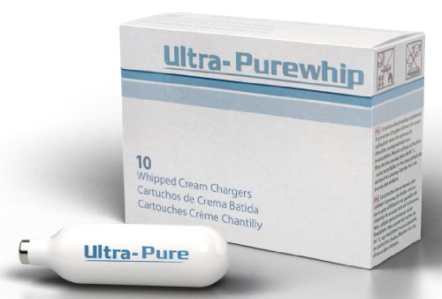 2 Boxes of 50 Ultra-Pure whip Whipped Cream Chargers. This is the highest quality European nitrous oxide whip cream chargers available. Ultra-Pure whip is produced by an Austrian company using the latest filtration technology for unmatched purity. Ultra-Pure whip is offered with the idea of offering the purest, highest-quality nitrous oxide cartridge for the cooking connoisseur at a economical price. Crafted in Europe's newest and most modern facility in either Vienna, Austria or approximately 40 miles in a new facility in Czech Republic, you will not be disappointed with the quality of this product. Standard 8 grams steel whipped cream chargers are filled with nitrous oxide from a French or Belgian pharmaceutical manufacturer (for superior quality assurance). Next, the cartridges are sealed and electronically weighed and coated with a high build paint for superior sealing and protection. Try this superior cream charger for guaranteed satisfaction. Ultra-Pure whip is always guaranteed to arrive with a full, 8 gram charge of 100% pure nitrous oxide. You will not discern any off-taste in even the most subtle whips, espuma, or delicately flavored sauces.Feature