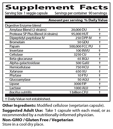 Doctor’s Best Digestive Enzymes is a uniquely formulated, full-spectrum high potency digestive enzyme blend created to complement and support the body’s own digestive capacities. Each capsule provides the body with enzymes designed to optimally aid the digestion of fats, proteins and carbohydrates present in cooked and raw food.* The formula supplies the added support of alpha-galactosidase and beta-glucanase to break down vegetables, beans and grains, and enzymes such as glucoamylase and invertase to assist with the digestion of sugars.* In addition, this complete formula contains friendly bacteria to uniquely promote optimal intestinal health.*Feature