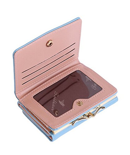 Feature : Material:PU Leather / Style:kiss-lock closure,fashion design,100% brand new,high quality! / Size:10x8x3cm(3.93x3.14x1.18inch),Color:Black,Blue,Yellow,Purple,Rose,Green,Pink / The front button closure with 7 card slots,1 photo/ID window,and 1 bill site compartment / A kiss-lock closure in the middle includes 1 coin pocket,,4 card slots and 1 photo window with a snap closure on the back of the wallet