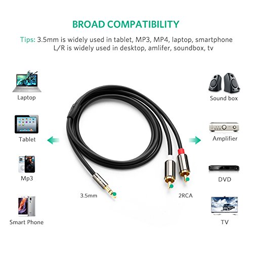Description Ugreen 3.5mm Stereo to 2RCA cable is ideal for connecting the output of your Cell Phone, IPod, MP3 player, Tablet or PC to your home audio system, while most mobile devices use the 3.5mm stereo headphone output, most home audio systems with an amplifier or receiver use RCA jacks for audio inputs.The slim metal case connector allows you to plug it to your source device without taking off your mobile/Tab case.