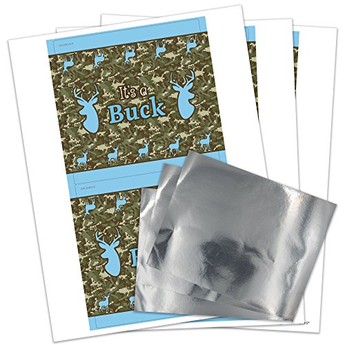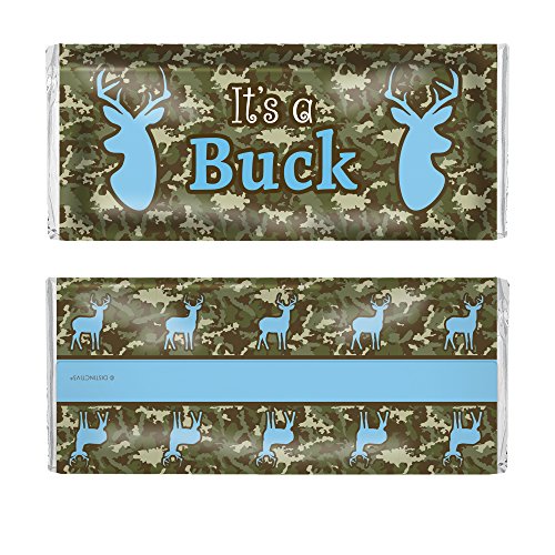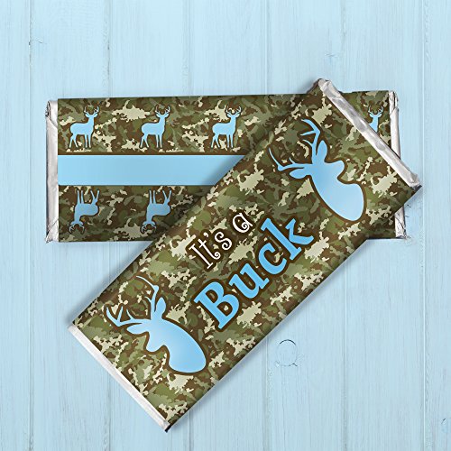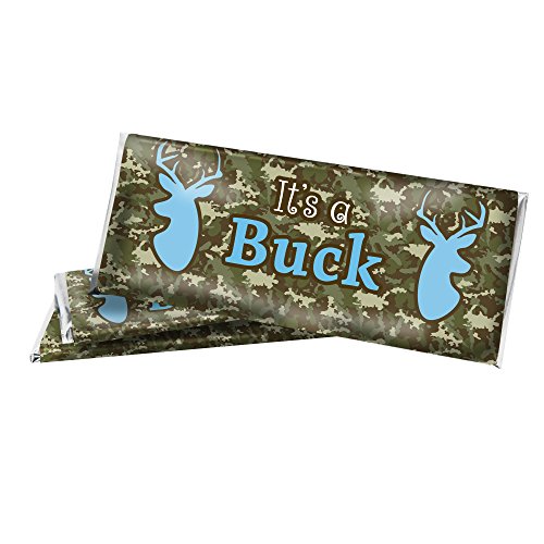 It's a Buck Deer Baby Shower Chocolate Bar Sticker Wrappers with Foils - Camo and Blue (Set of 12)