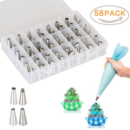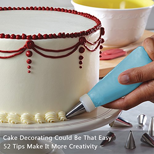 Studio : AINEED Publisher : AINEED Product Description Cake Decorating Could Be That Easy! AINEED Cake Decorating tip set, will be a terrific and amazing gift for your friends or family, and for sure will bring a lot of fun and laugh with your kids during the handmade time! Just let creativity strikes! Features: - All tips are made from the highest quality, 100% food grade stainless steel (304) and corrosion resistant. - All tips, silicone pastry bags, couplers and case are tasteless and non-toxic. - Easy to clean and dishwasher safe, reusable and non-stick. - Compact, lightweight and easy to use. - Perfect tools to decorate your cakes, muffins, cupcakes, cookies and more. How to use Piping Nozzle tips? 1. Wash the tips in hot water. 2. Cutting bags 1-2mm from top for tips to pop out. 3. Insert one tip to each bag. 4. Put butter cream in the bag. Butter cream must be firm, room temperature, not too soft or the buds will be closed. Pop in the fridge, if necessary. 5. Place the tip to the cupcake/cake base, and squeeze the bag gently to create beautiful pattern. 6. Use a leaf tip to fill in gaps - this will complement the overall effect. 7. After use, wash in hot soap water and dry. Package: Stainless steel tips*52 Plastic couplers*3 Silicone pastry bag *3 Plastic storage case*1 0