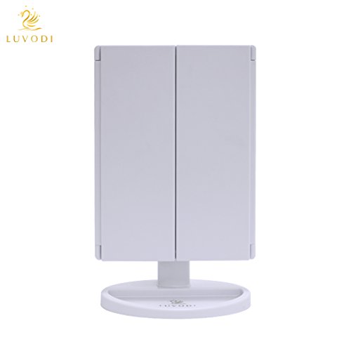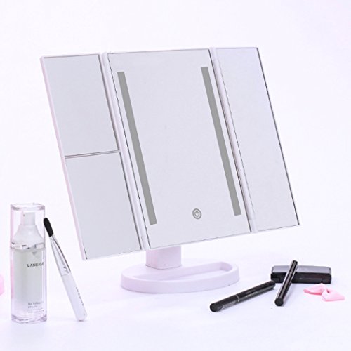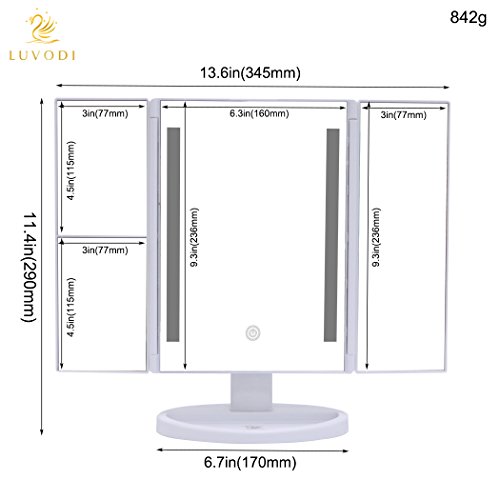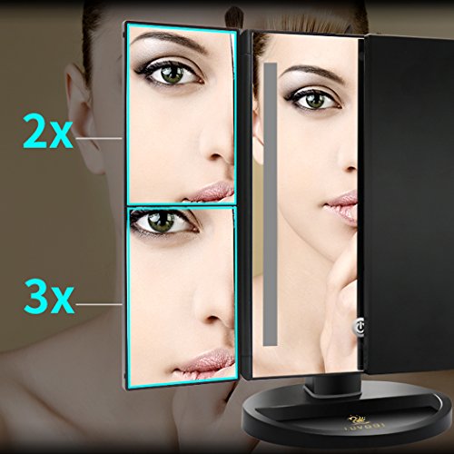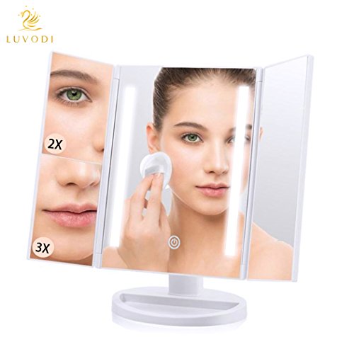 LUVODI Lighted Vanity Makeup Mirror Tri-Fold 36PCS LED Light Touch Screen Cosmetic Mirror 3X/2X Magnification 180 Degree Free Rotation USB Charging Illuminated Tabletop Compact Mirror