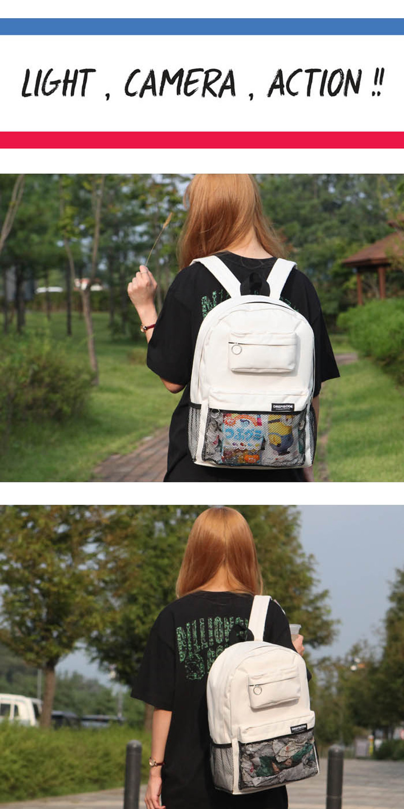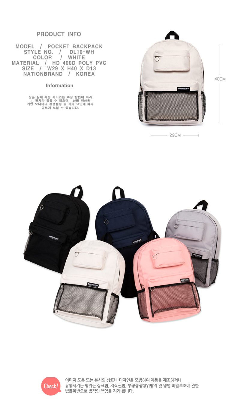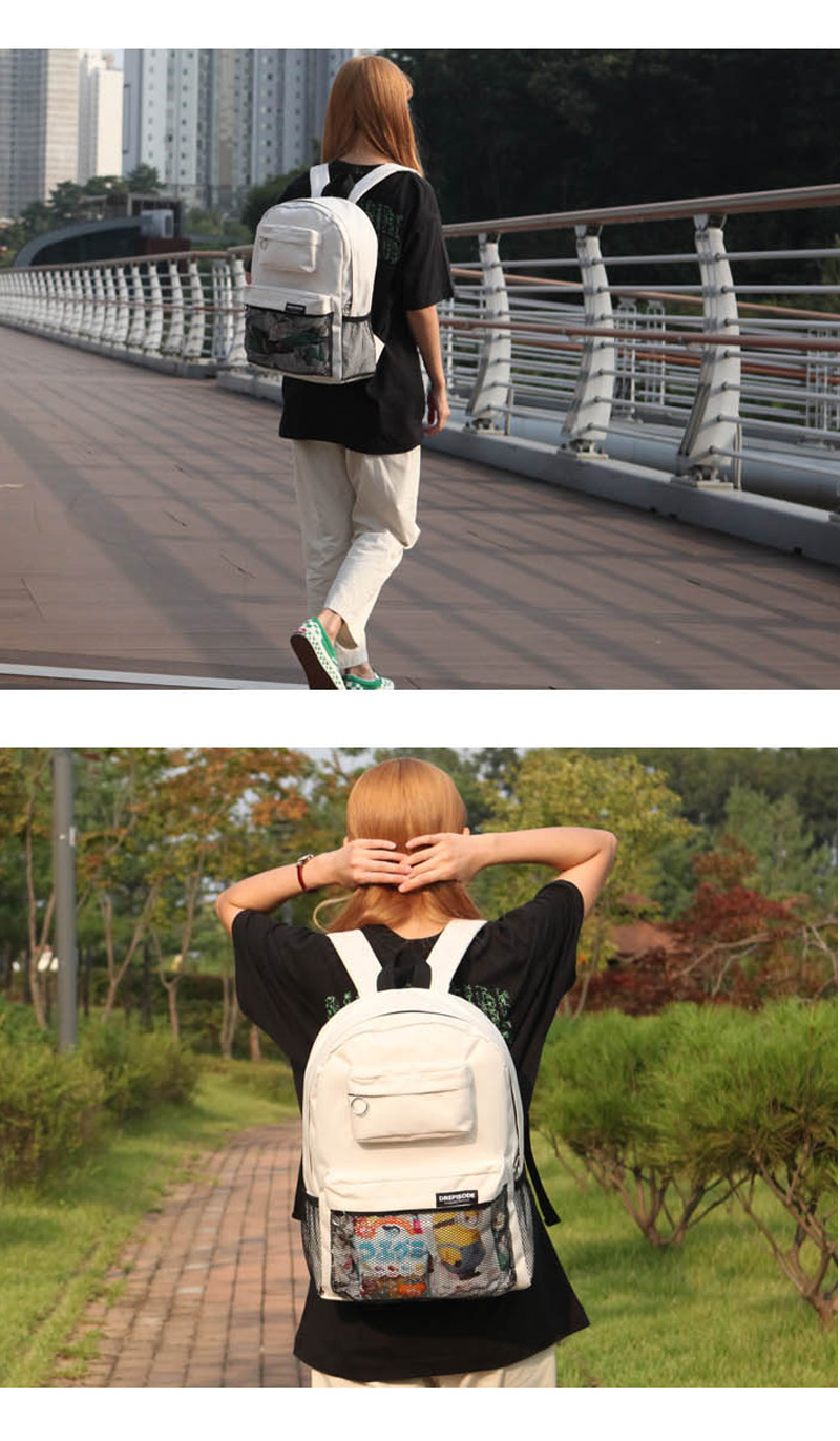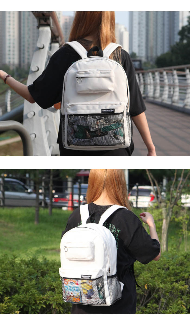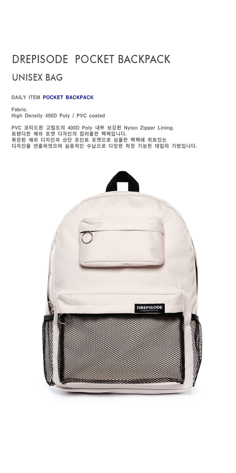 트렌디한 메쉬 포켓과 상단 포인트 포켓으로 심플한 백팩에 위트있는 디자인을 연출하였습니다.