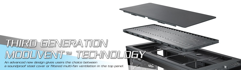 The spacious and fully adaptable framework of the Define R6 sports nine fan mounts, integrated PWM fan hub and support for radiators up to 420mm, making it the perfect platform for building your dream water loop. Improved third generation ModuVent™ technology allows an effortless transition from steel-clad sound dampened top panel to filtered high airflow multi-fan ventilation setup.