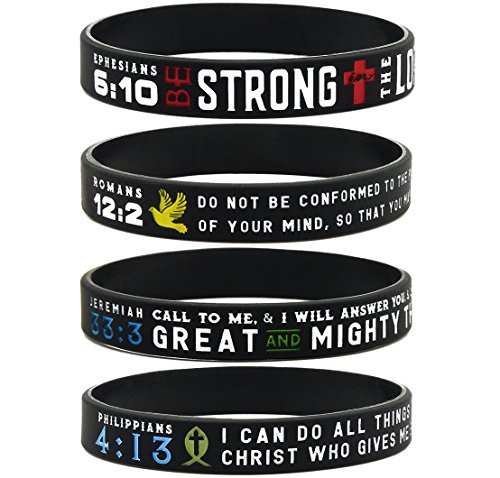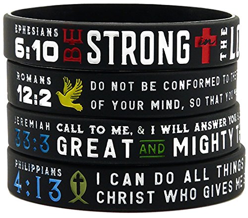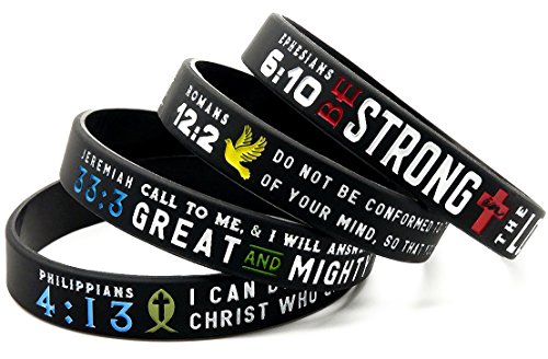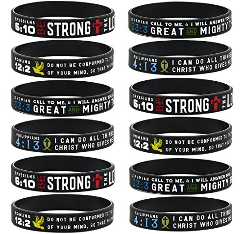 - Pack of 12 silicone wristbands with Christian symbols and scriptures; Standard unisex size of 8" around fits most adult men, women, and teens. Includes an assortment of 4 different Bible verses.