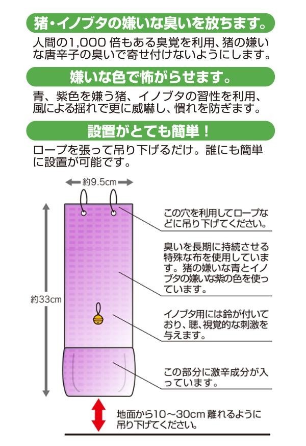 猪・イノブタの嫌う唐辛子成分を配合。臭いに敏感な猪の習性を利用、嫌いな臭いで寄せ付けないようにします。また、青や紫色を嫌う習性を利用し、色・揺れで威嚇する事により慣れを防ぎます。 |