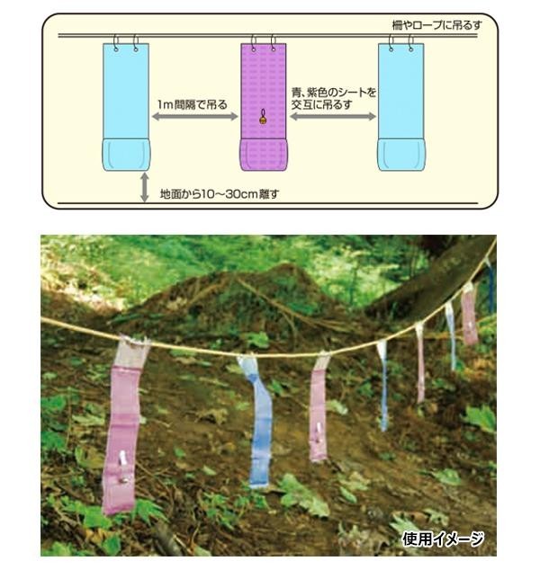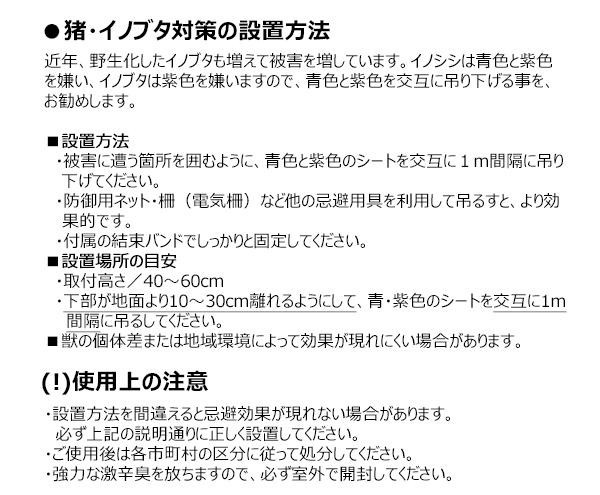 | 猪・イノブタの嫌う唐辛子成分を配合。臭いに敏感な猪の習性を利用、嫌いな臭いで寄せ付けないようにします。また、青や紫色を嫌う習性を利用し、色・揺れで威嚇する事により慣れを防ぎます。 |