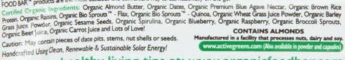 -. Binding : Health and Beauty -. Brand : Organic Food Bar -. IsAdultProduct : 0 -. Label : ORGANIC FOOD BAR -. Manufacturer : ORGANIC FOOD BAR -. PackageQuantity : 1 -. ProductGroup : Health and Beauty -. ProductTypeName : HEALTH_PERSONAL_CARE -. Publisher : ORGANIC FOOD BAR -. Studio : ORGANIC FOOD BAR -. Title : Active Green Bar