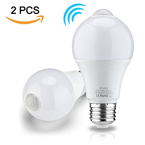 RAYHOO 12W Motion Sensor Light Bulb,1000 Lumens, E26/E27 A60 LED Light Bulb with PIR Motion Sensor, for Front Door Garage Basement Hallway Stairs, 6000K White, 2-Pack