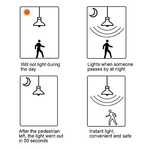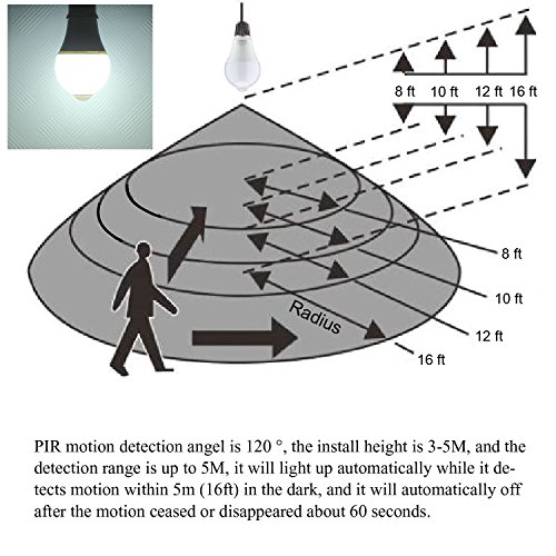 - PIR Motion Sensor Included: High quality PIR infrared sensor is installed at the tip of bulb, so the motion sensor bulb will light up automatically while it detects motion within 8-10 FT in the dark, and automatically off after the motion ceased or disappeared about 60 seconds. NOTE: Make sure the sensor is pointing down within proper distance and angle