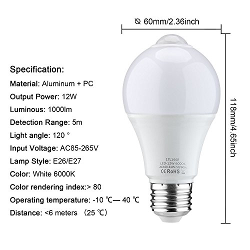 - Output Power: 12W; Input Voltage: AC85-265V; White 6000K; Luminous: 1000lm; Lamp Base:E26/E27; Shape: A60, Package Content: 2 x RAYHOO Motion Sensor Lights Bulbs. One year warranty, Please contact Rayhoo if the light has any problem, we will help to solve your problem.