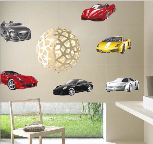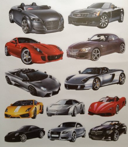 -. Feature : Includes sports cars and their logos / Applies to any smooth surface / Removable and reusable with no sticky residue / Dimension of product sheet: 17Wx23L