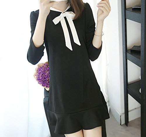 -. Feature : ネックラインにリボンを施した清楚で可憐な印象のAラインワンピースです。秋冬春夏オールシーズンお使い頂けます。きちんと感があり、デイリースタイルからパーティーシーンまで幅広く活躍してくれるアイテムです。 / 全体がシックで落ち着きのあるブラック、襟にホワイトのボウタイリボンがアクセントになり華やかさをプラスしてくれる洋服です。 / 裾はふんわり上品に広がる立体的なフレアシルエットが魅力のひとつ。シンプルに一枚で大人可愛くおしゃれに決まります。 / 通勤、通学などのデイリーはもちろん、デートやお呼ばれ、ナイトパーティやフォーマルなシーンまで活躍してくれる優秀ワンピです。スタイリッシュなドレス風のミニ丈で、伸縮性があり着やすい1着となっております。 / 【サイズ】M:胸囲86cm 肩幅37cm 袖丈59cm 着丈82cm L:胸囲90cm 肩幅38cm 袖丈60cm 着丈83cm 【カラー】ブラック×ホワイト 無地