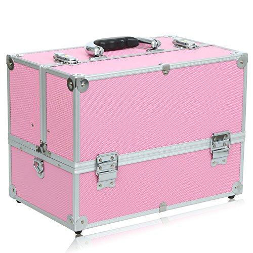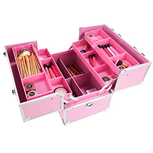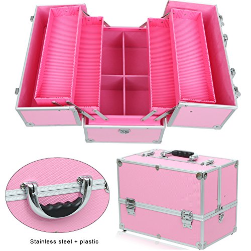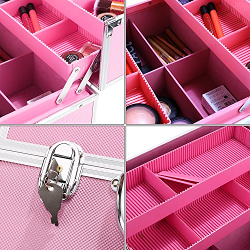 Anfan Aluminum Makeup Train Case Professional Travel Cosmetic Organizer Box Kit with 4 Adjustable Trays & Keys (Pink)