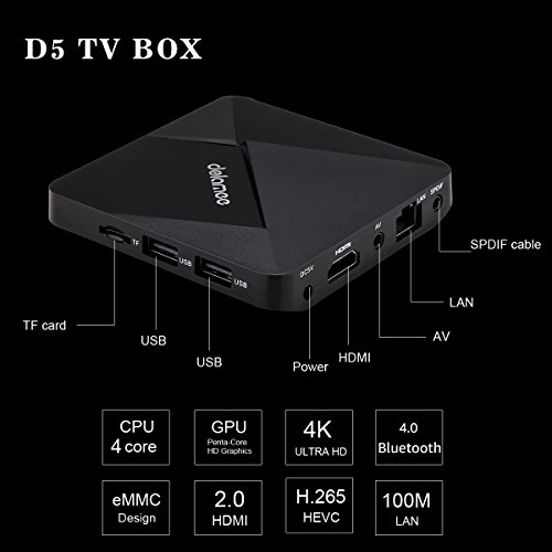 Studio : DOLAMEE Publisher : DOLAMEE Binding : Electronics Product Description Hardware Specifications RAM: 2GB DDR3 ROM: 16GB eMMC Flash Main features Support the latest HEVC (H.265) decoding Support the latest VP9 decoding Support 4K*2K Super HD video OS: Android 6.0 OS Wifi: IEEE 802.11b/g/n, 2.4G Bluetooth: V4.0 LAN: Ethernet:10/100M, standard RJ-45 HDMI: HDMI 2.0 4K*2K 60Hz SPDIF: SPDIF output Wireless: Support 802.11 b/g/n, 2.4G Support Decoder format: HD MPEG1/2/4,H.264,H.265,VP9, HD AVC/VC-1,RM/RMVB,Xvid/DivX3/4/5/6 ,RealVideo8/9/10 Support Media format: Avi/Rm/Rmvb/Ts/Vob/Mkv/Mov/ISO/wmv/asf/flv/dat/mpg/mpeg Support Music format: MP3/WMA/AAC/WAV/OGG/AC3/DDP/TrueHD/DTS/DTS/HD/FLAC/APE Support Photo format: HD JPEG/BMP/GIF/PNG/TIFF Package include 1 * D5 Smart Tv Box 1 * Power Adapter (5V 2A ) 1 * Remote Control 1 * User Manual 1 * HDMI Cable 0