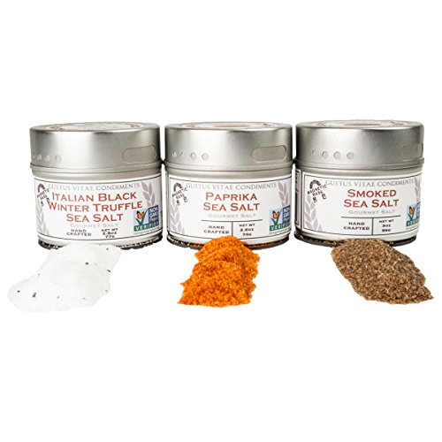 -. Binding : Misc. -. Brand : Gustus Vitae -. EAN : 0859866004253 -. Feature : Non-GMO. All natural: free from artificial colors and flavors. / Magnetized backing; signature magnetic plate / Hand packed in California from local and imported ingredients. / Not irradiated or treated with EtO gas. / Crafted in small batches -. IsAdultProduct : 0 -. Label : Gustus Vitae -. Manufacturer : Gustus Vitae -. PackageQuantity : 1 -. ProductGroup : Grocery -. ProductTypeName : GROCERY -. Publisher : Gustus Vitae -. Studio : Gustus Vitae -. Title : Gourmet Finishing Salts Seasoning & Spice Collection -. UPC : 859866004253