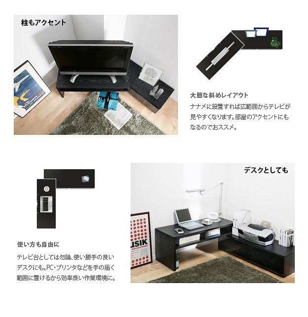 商品について:アイデア次第で色々使えるスライド式のTVボード。部屋の形に合わせて角度を変えられるからどんなレイアウトも思いのまま♪背面にテーブルタップを収納できるのでコード類の扱いも簡単☆前後に動くキャスター付きで配線作業、お掃除はラクラク。天板耐荷重50kg