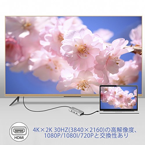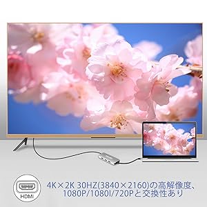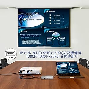 【HDMIポート】:4K×2Kに適用、30Hz(3840×2160)の高解像度、1080i/1080p/720pと交換性あり。HDMIポートをHDMIケーブルと接続して、ケーブルのもう一端をHDTV/モニター/プロジェクターと接続してください。それで、パソコン/スマホ/タブレットの画面はきれいにHDTV/モニター/プロジェクターに映ります。4Kまでの高解像度ビデオを出力できるから、自宅でハイビジョン画面を楽しまれます。もちろん会議、結婚式宴会などさまざまな場面にも使えます。
