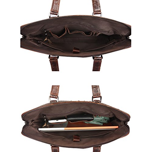Basic Specifications Main Material: Crocodile print real leather Dimension ( W x H x D ): 15.8 x 2.6 x 11.4 inch Handle drop 5.9 inch Color: Dark Brown Laptop size: 14 inch laptop