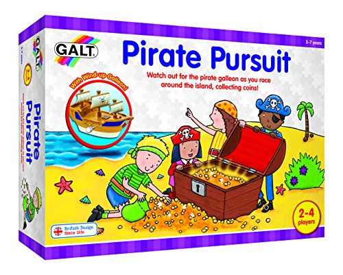 -. Feature : The treasure hunt is in! The award-winning Pirate Pursuit game from Galt has children racing across the board to get to the gold first / A fun way to encourage counting and early math skills in young children / Winner of the Family Fun T.O.Y. of the year award / Includes 1 game board (17" x 21"), wind-up pirate ship, 4 loot bags, 24 play coins, 4 pirate counters, dice, dice shaker and play-guide / For 2-4 players aged 3 and up / Galt's award-winning Pirate Pursuit game helps young children learn to count while having fun / Wind up the pirate galleon and sail around the island, filling your bag with loot / Includes game board, wind-up pirate galleon, 4 loot bag boards, 24 play coins, 4 pirate counters, dice, shaker and guide / Award-winning Pirate Pursuit Game for 2 - 4 players is suitable for children aged 3 - 7 / Galt products are quality controlled and meet all American, Canadian, British and European standards for toy safety