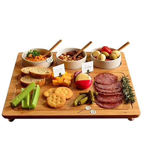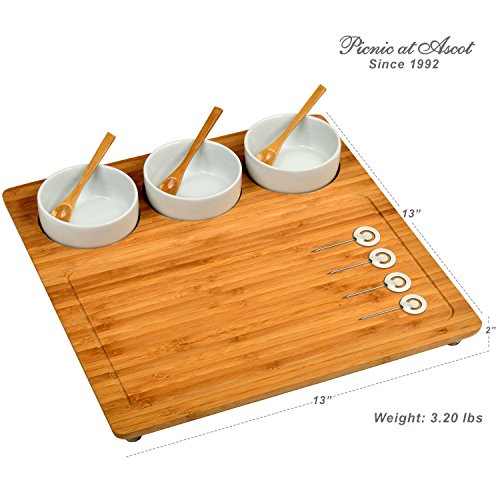 Studio : Picnic at Ascot Publisher : Picnic at Ascot Product Description This unique Bamboo Serving Tray includes three removable ceramic bowls and 3 small bamboo serving spoons. The bowls are inset in the board for stability but are removable to re-fill and/or clean. The board has gracefully rounded corners, a milled juice grove, and permanent clear protective, non-slip feet. It's a great size for a casual party and makes an excellent wedding or welcome gift. Lifetime Warranty. 0