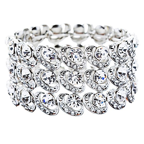 -. Feature : Color: Silver, Clear / Material: Clear Crystal Stones & Rhinestones, Metal Casting, Rhodium Plated / Dimensions (Size): Approx. 1.50" Wide / Style: Cycle-Shape Cuts, Faceted, Texture, Stretchable / Lead Compliant