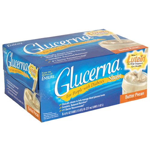 -. Binding : Health and Beauty -. Brand : Glucerna -. EAN : 0070074543222 -. Feature : Case of four boxes, each containing six 8-ounce nutritional shake bottles (24 total bottles) / Excellent source of 24 essential vitamins and minerals; provides 100% RDA of Vitamins C and E / Lactose-free / Specially designed for people with diabetes / Winner of the 2006 ChefsBest Best Taste Award; from the makers of Ensure -. Label : Glucerna -. Manufacturer : Glucerna -. MPN : na -. NumberOfItems : 4 -. PackageQuantity : 1 -. PartNumber : na -. ProductGroup : Health and Beauty -. ProductTypeName : HEALTH_PERSONAL_CARE -. Publisher : Glucerna -. ReleaseDate : 2005-08-09 -. Studio : Glucerna -. Title : Glucerna Nutritional Shake, Butter Pecan, 24- 8 Fluid Ounce Cans -. UPC : 070074543222