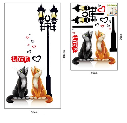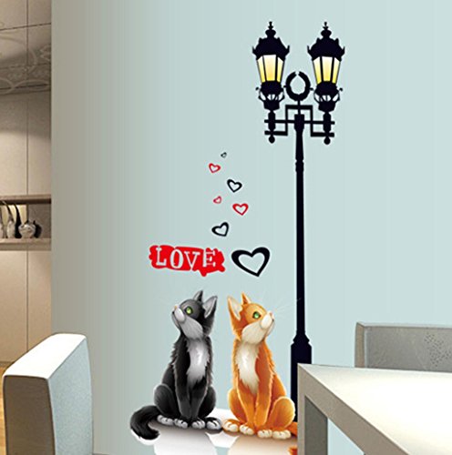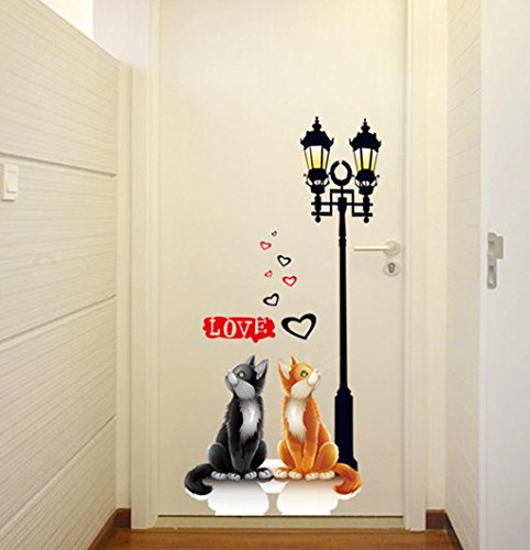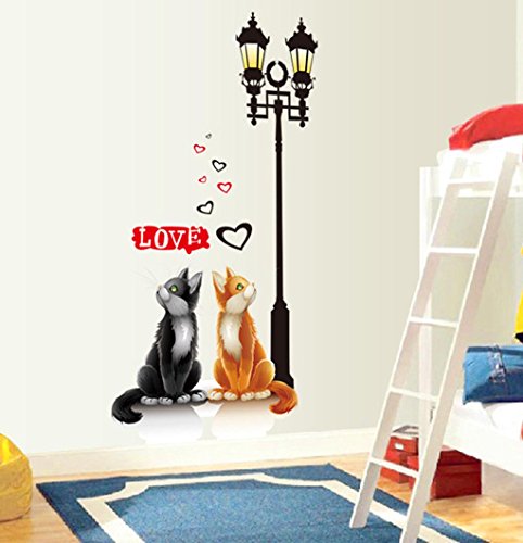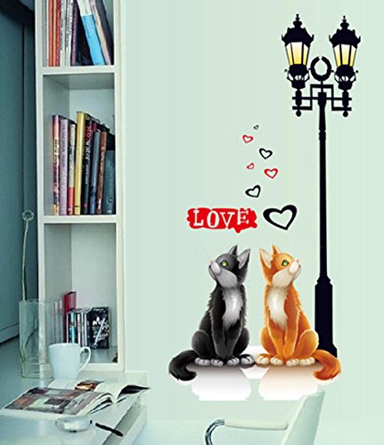 BIBITIME Black Cat and Yellow Cat Lovers Dating under street light Love Heart Wall Decal for Couple Bedroom Living Room Behind Door Kids Nursery