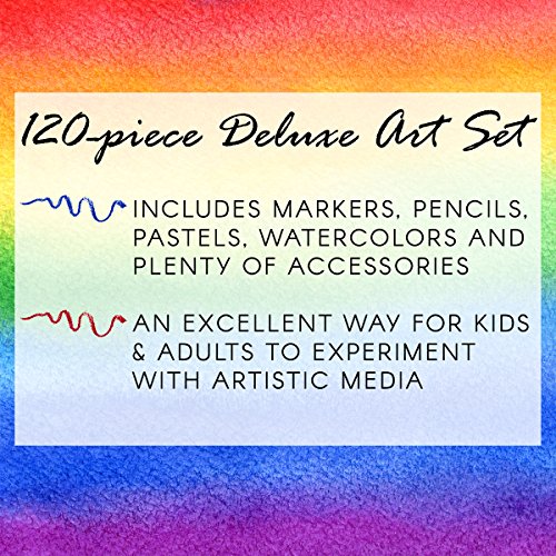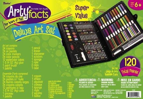 ReleaseDate : 2013-07-28 Studio : Darice Publisher : Darice Binding : Kitchen Product Description This Arty Facts 120-Piece Set overflows with color and creativity. Look at the possibilities-markers, pencils, pastels, watercolors and plenty of accessories. All in a closeable, book-like case. A portable art studio to take with you wherever you go. Includes the following supplies: 24 markers, 24 crayons, 24 color pencils, 24 oil pastels, 12 watercolor cakes, 2 clips, 1 white watercolor tube and 1 of each: palette, paintbrush, drawing pencil, sharpener, eraser, ruler, sponge and scissors. Small parts, not for children under 3 years. 0