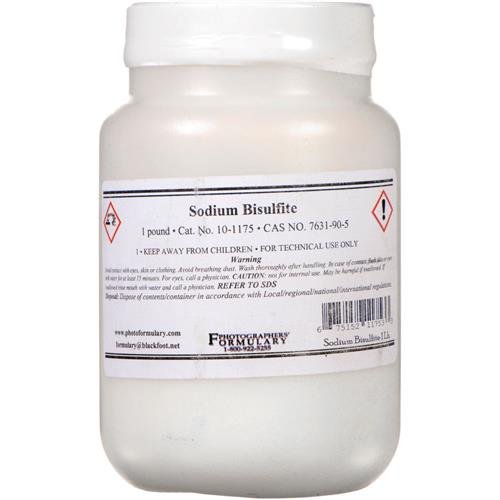 Studio : Photographers' Formulary Publisher : Photographers' Formulary Binding : Electronics Product Description Sodium Bisulfite Uses: In acidulating and preserving fixing baths As a preservative for pyro developer Note: Can be substituted weight for weight with sodium metabisulfite. Very soluble in water, insoluble in alcohol 0