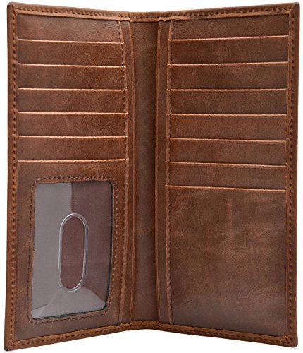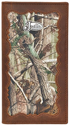-. Feature : Brown distressed leather shell / Realtree® AP camo leather inlay / Silver tone Justin concho / Man made lining / Protective identification window
