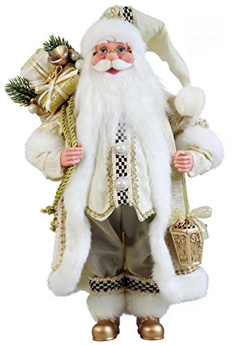 -. Feature : There is a stylish & chic matching black and white checkered trim on his vest, pants, and cap / In one hand he has an intricate lantern to bring light and warmth to your holiday season / The other is carrying loads of gold & white fabric wrapped presents with a miniature French Horn and evergreen floral / His flowing soft beard and mustache, plus his rimless gold glasses, accentuate his huge Santa smile / See all Windy Hill Collection Santas, Angels, and Elves by typing in "Windy Hill Collection" in the Amazon search box