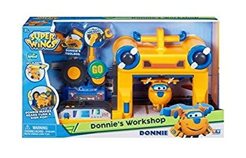 I'm ready to make things happen!" is Donnie's motto, and now Super Wings fans can make things happen with Donnie's workshop playset! Rev Donnie up and place him in the work bay to see the gears spin and "go" sign pop. Or use the special multi-tool to engage the gears. Includes a Vroom 'N zoom Donnie vehicle that can speed through the hangar door, as well as Donnie's special tool box that opens & closes. Donnie's workshop has everything Donnie needs to fix things for his Super Wings friends! No batteries needed and is designed for children 3 years of age and up.Feature