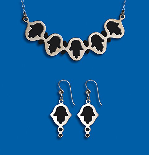 -. Binding : Jewelry -. Brand : Shira Jewelry -. Department : womens -. Feature : Pile on the luck with this fabulous sterling silver jewelry set of Hamsa charms. / The black elements are made of anodized aluminum. / Give the matching necklace and earrings as a gift for any occasion. Items also available individually. / Made in the USA / Measurements: pendant - 2 1/2" x 1", necklace length - 18 1/2", earrings - 15/16" x 9/16". -. Label : Shira Jewelry -. Manufacturer : Shira Jewelry -. Model : SH-139 -. MPN : SH-139 -. PartNumber : SH-139 -. ProductGroup : Jewelry -. ProductTypeName : FASHIONOTHER -. Publisher : Shira Jewelry -. Studio : Shira Jewelry -. Title : Hamsa String Sterling Silver Jewelry Set - Necklace and Earrings with Black-Colored Anodized Aluminum Background