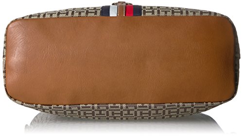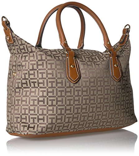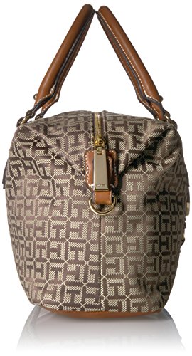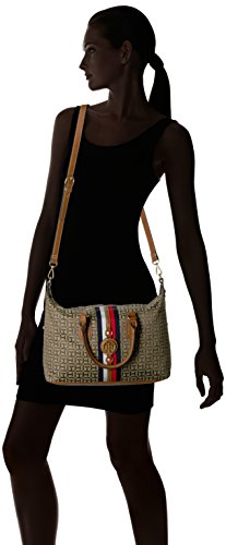 Top handle satchel handbags for women featuring the Tommy Hilfiger women signature flag stripe and gold TH hardware. Double top handles and removable convertible strap with gold hardware details. Flat bottom, top zip closure. Lined nylon interior with wall zip pocket and slip pocket. This Tommy Hilfiger bag is a versatile essential, perfect for your next work bag. Our timeless Tommy Hilfiger handbag is a stylish addition to your collection of top handle handbags. 13-3/4" length; 8-1/2" height; 5-1/2" width; 3-3/4 23-1/2" drop.Feature
