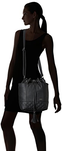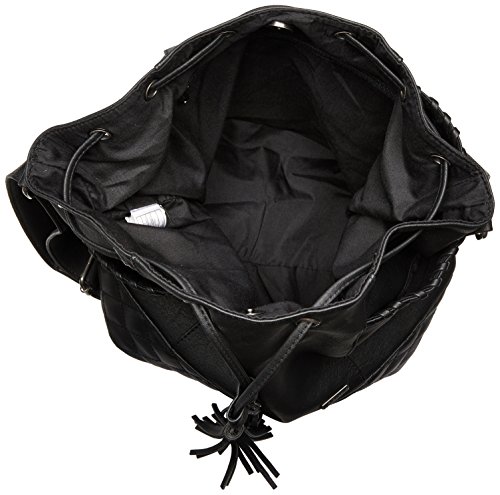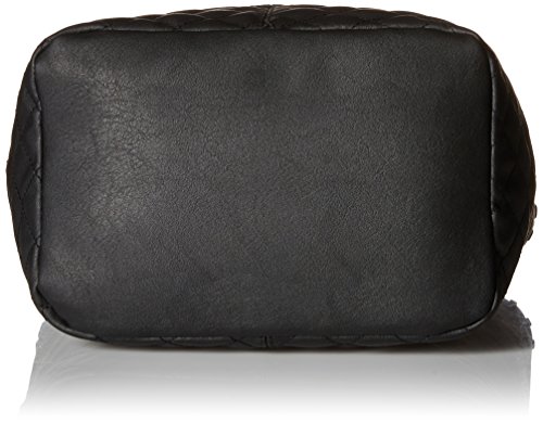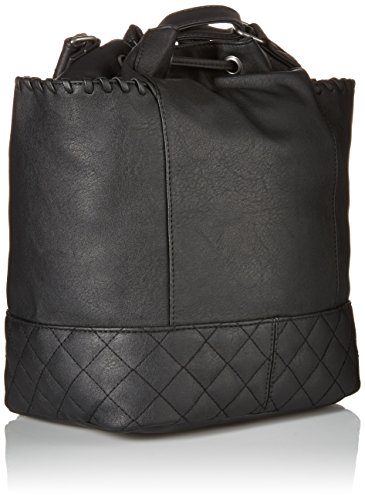 Faux-leather basket bag with magnetic snap closure, whip stitching details on side pockets, inside zipper pocket, adjustable shoulder strap, quilted stitching at bottom panel, tassels, and Roxy metal plate.