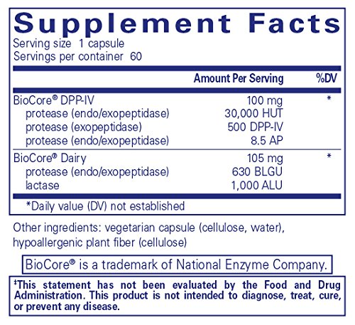 Gluten/Dairy Digest contains a blend of digestive enzymes targeting gluten and dairy digestion. It provides a blend of proteases specially formulated with dipeptidyl peptidase IV (DPP-IV) activity to help break down gluten peptide fragments in normal digestive systems. Studies suggest that it may also promote a healthy cytokine balance to support GI comfort and function. Additionally, this formula provides a unique mixture of protease enzymes and lactase to assist digestion of multiple constituents of milk and dairy products. Protease enzymes targeting casein and beta-lactoglobulin proteins support dairy protein digestion. Casein is the predominant protein in milk and cheese. Beta-lactoglobulin occurs primarily in the whey fraction of milk. It is an acid-stable protein and therefore may not be broken down by pepsin and pancreatin. Lactase breaks down the milk sugar lactose, helping to relieve occasional bloating or gas that some people can experience from dairy consumption. If you are on a controlled diet and/or under the care of a health care professional for dairy and/or gluten digestion, continue to follow those recommendations. This product is not intended to substitute for the recommendations of a health professional.Feature